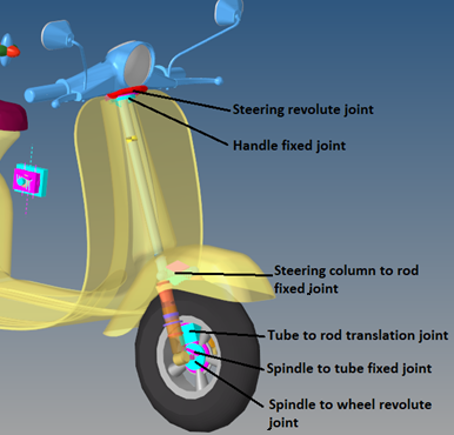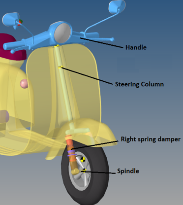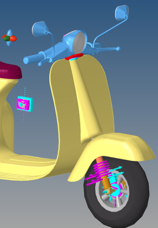 フロントテレスコピックフォークサスペンションシステムは、二輪のフルビークルモデルに使用できます。デフォルトの形状と質量は二輪スクーターの形状と質量を近似したものですが、このモデルとデータは任意のサイズの二輪車を反映するように修正できます。