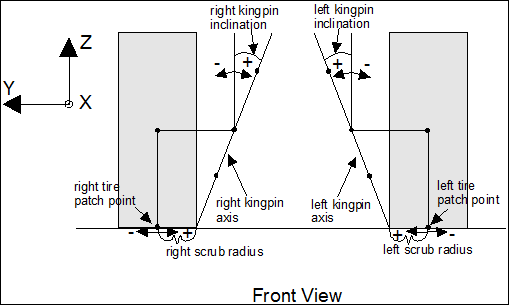 F2 | RESULT(2) | Left Caster Angle | 度 | 全体を側面から見た場合の左ホイールのキングピン軸と全体座標系垂直方向との間の角度です。キングピン軸の下が車両の前方を、上が車両の後方を向いている場合、符号は正です。右記の図をご参照ください; 図 1 |
