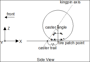 F3 | RESULT(3) | Right Caster Angle | 度 | 全体を側面から見た場合の右ホイールのキングピン軸と全体座標系垂直方向との間の角度です。キングピン軸の下が車両の前方を、上が車両の後方を向いている場合、符号は正です。右記の図をご参照ください; 図 1 |