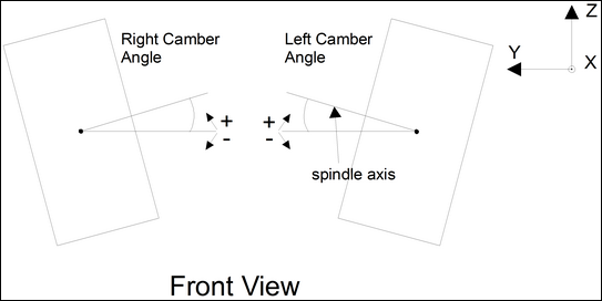 F6 | RESULT(6) | Left Camber Angle | 度 | 全体を前から見た場合の左ホイールのスピンドル軸と全体座標系Y(横方向)ベクトルの間の角度です。タイヤの上部よりタイヤの下部が車体中央にある場合、符号は正です。図 2をご参照ください。 |