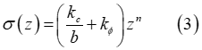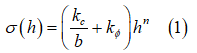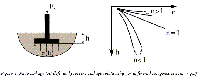 路面が均一であると仮定すると、その路面の圧力と沈下量の関係は図1に示した形態のいずれかとなり、Bekkerが提唱した次の経験式で特性記述できます。[1]