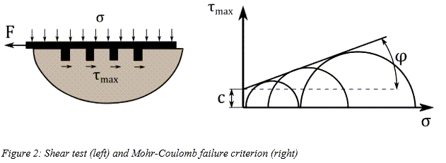 は材料の内部せん断抵抗が示す角度です。上記の各種パラメータは、図2に示すように、さまざまな圧力下でのせん断テストから導かれます。