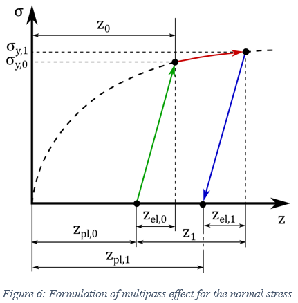 マルチパス効果では、繰り返し法線荷重に対する土の応答を確定する必要があります。具体的には、土が事前圧縮されている場合は、法線方向応力の数学的記述を修正する必要があります。図6に示すように、初期の法線方向応力は弾性部分で構成されます