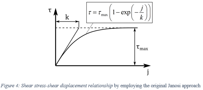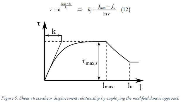 ただし、土壌破壊のため、せん断応力はせん断変位の特定の値以上に減少します[3]。ここで、この影響を考慮するための簡単なアプローチが提示されます。そこでは土壌の最大せん断強度がせん断変位の関数を構成します[3]。これに基づいて、改良型Janosiアプローチが次の形式で得られます。