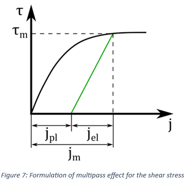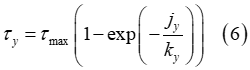 法線方向応力と同様のアプローチが、せん断応力のマルチパス効果の説明にも採用されます。具体的には、初期の土壌せん断応力は、次の式を使用してせん断変位の関数として定式化されます。