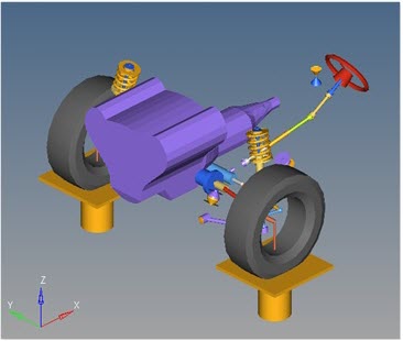 静的ライド解析は、ハンドルを固定した状態における、両方のホイールの同相の上下移動のシミュレーションです。シャシーは地面に固定されます。ホイール中心の変位は、ユーザーによって指定されます。サスペンションは、単純な制御システムと、“サスペンションテストリグ”を介して動きます。ホイールは、面内ジョイントを使用して、タイヤパッチ位置でサスペンションテストリグに対して拘束されます。標準のサスペンションリクエスト(キャスター、キャンパー、トーなど)は、ライド解析の一部として含まれており、ここではこのリクエストについて説明します。サスペンションのライド解析はフロントおよびリアで同様です。