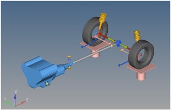 静的ライド解析は、車両の前半分および後ろ半分についてMotionViewのAssembly Wizardで構築したモデルで動作するように設計されています。この解析は、Task Wizardを使用して追加すると自動的にモデルに付加されます。解析のアタッチメント方式が厳密に順守されていれば、手動で構築したモデルで解析を使用できます。 図 1. フロントサスペンションの静的ライド解析