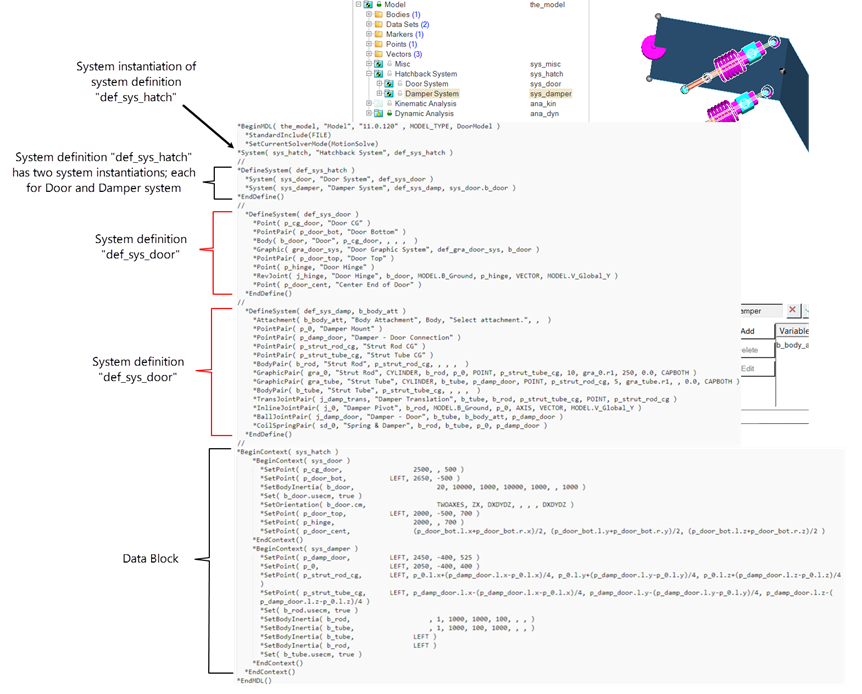 以下の例のモデルは、システムのコンセプトを表すものです。このモデルは、~hw_install/demos/mv_hv_hg/modeling/mdl_examples/container_entities/system_analysis/door.mdlに用意されています。下の図は、車のハッチバックドアの簡略化されたモデル、およびそのモデルのmdlファイルを示しています。このモデルは、Hatchback Systemというシステムにまとめられており、そのシステムには2つの子システムとしてDoor SystemとDamper Systemがあります。