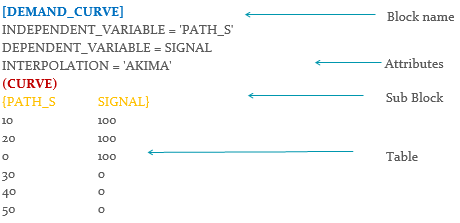 - 上記の例では、TAG, SATURATION, LOOK_AHEAD_TIME, DEMAND_FILE, INTEGRATION_STEP_SIZE が属性名となります。