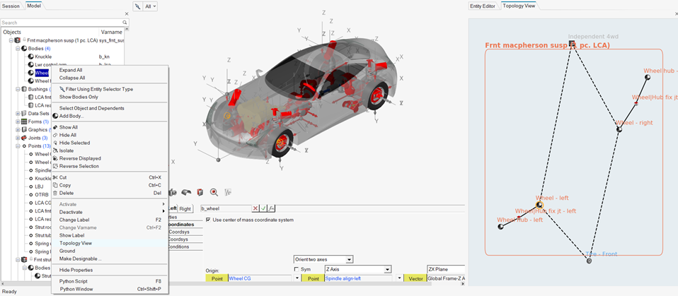 Topology Viewは、以下の各エンティティで使用できます:ボディ、ジョイント、ブッシュ、スプリングダンパー、フォースとビーム、システム、アセンブリ、アナリシス。