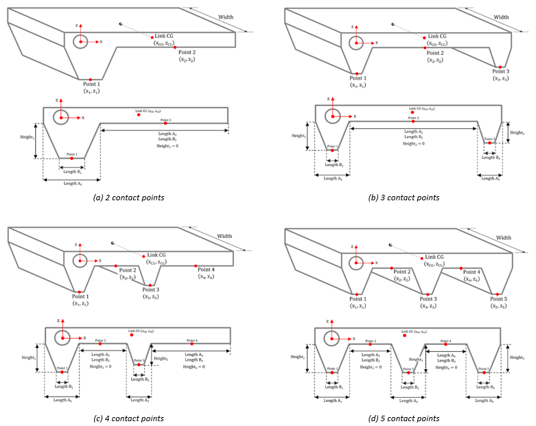 Contact Pointsでは、そのクローラ・履帯リンクを表すポイントの数を定義します。モデルに許される最大のポイントは5点です。接触ポイントのX座標とZ座標は、クローラ・履帯ピンの中心(赤色の座標系)を基準にする必要があります。XcgとZcgは、ピンの中心からリンクCG位置までの縦方向と垂直方向の参照距離です。下の図は、接触ポイントが2つ、3つ、4つ、5つのクローラ・履帯リンクを示しています。