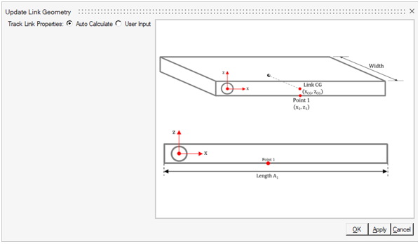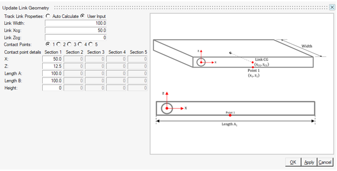 デフォルトオプションはAuto Calculateに設定されています。このオプションでは、クローラ・履帯のプロパティセクションで指定されているパラメータを考慮します。クローラ・履帯リンクの形状が異なる場合、User Inputオプションによって、クローラ・履帯リンクの寸法を変更できます。