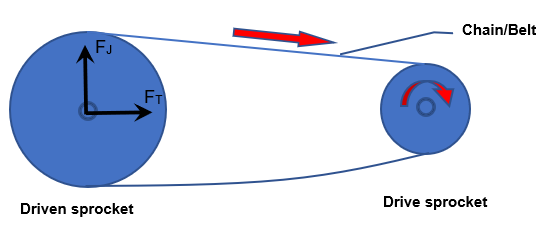 - FJ: 駆動スプロケットによって張力が強い側へチェーンが引っ張られることに起因するジャッキ力(垂直力)。
