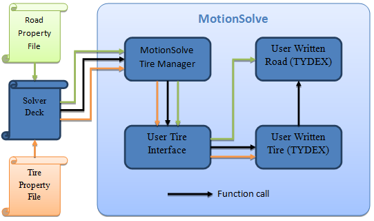 • MotionSolveのソルバーデックは、タイヤプロパティファイルと路面プロパティファイルをMotionSolveのTire Managerに渡します。
