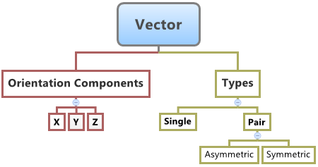 MotionViewで作成されるほとんどのエンティティと同様に、ベクトルエンティティはシングルエンティティまたはペアエンティティにすることができます。ペアエンティティは、モデルのZ-X平面を中心として対称になっているモデルの作成に役立ちます。これらのプロパティも、Z-X平面を中心として対称にすることができます(つまり、Yプロパティが鏡面コピーされます)。ベクトルの非対称性または対称性は、作成したベクトルの編集時に決まるか、指定できます。