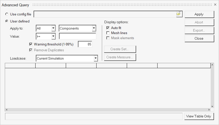 注: このオプションは、コンタープロットがモデルに適用されている場合にのみアクティブとなります。ヒント: Advanced Queryでは、パート境界結果もサポートされます。パートの総和や最大 / 最小用のの式を作成するためのResult Mathを使って、モデル全体およびすべての荷重ケースをAdvanced Queryでループさせ、Top N/Bottom Nランクのパートを探すことが可能です。 -