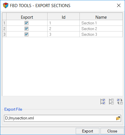 HyperViewでFBDセクションを定義すると、Exportダイアログ(下の図参照)を開き、どのセクションをエクスポートするかを選択できます。