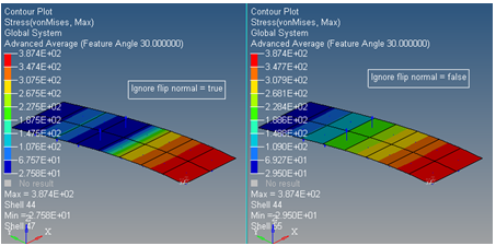 上記の例で、平均化のためのフィーチャー角度閾値は30度に設定されています。左側の図では、隣接する要素の法線間の角度はほぼ180度であり、閾値30度の条件を満たしません。右側の図では、法線間の角度は30度未満であり、フィーチャー角度の閾値の条件が満たされています。しかし、これはモデル化の相違で、左側の図の要素は値の平均化が可能で、右側の図の要素は平均化できないことも考えられます。このためには、Ignore flipped normalsオプションをアクティブにします。