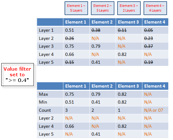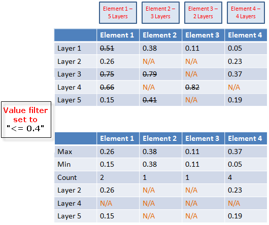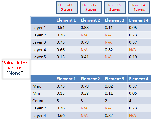 以下の表は、CountオプションおよびValue Filterが連携する様子を示しています:図 4.