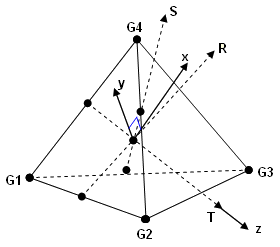 - Tetra(四面体)要素についての要素座標系は、向かい合う辺の中点を結ぶ3つのベクトルR、S、Tを使って定義されます。