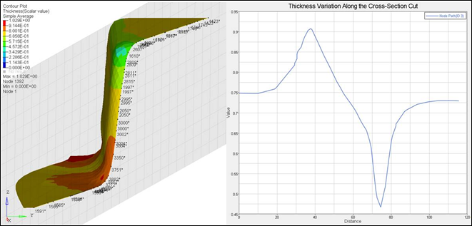 結果として得られる断面に沿った変化は、断面に沿った節点パスを定義することによっても考察できます。これは、ユーザーに固有の断面上のパスに沿った結果の変化をエンジニアが評価する際に役立ちます。スタンピングについてはしばしば、実験データに対してシミュレーションを検証する必要があります。実験データを得るための一般的な方法の1つとして、スタンピングされたパートを2つにカットし、断面の長さ方向の厚みを測定する方法があります。そのようなデータとFEA結果との比較を可能にするには、FEAモデルの断面に沿ってパスを定義し、選択したFEAの結果タイプを下の図に示すようにプロットできる必要があります。図 2.