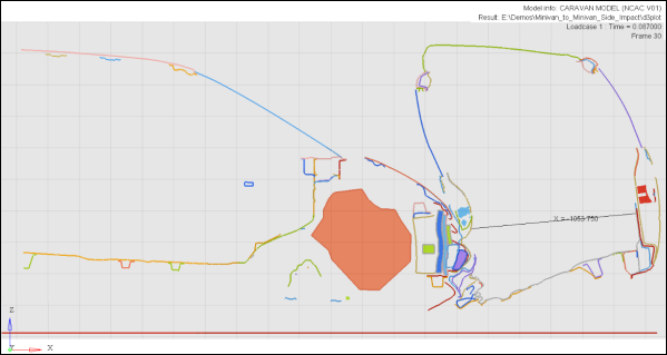 断面の計測値の典型的な適用例は、断面上の節点間の距離や位置のプロットです(下の図に示すような貫入の測定)。車両Bピラー断面の向かい合う辺の間の距離を測ると、乗員の居住空間に構造がどれだけ貫入しているかが分かります。断面の計測は、メッシュの節点のみを考慮することでは不可能であり得る、2辺を隔てる最小距離の特定に役立ちます。