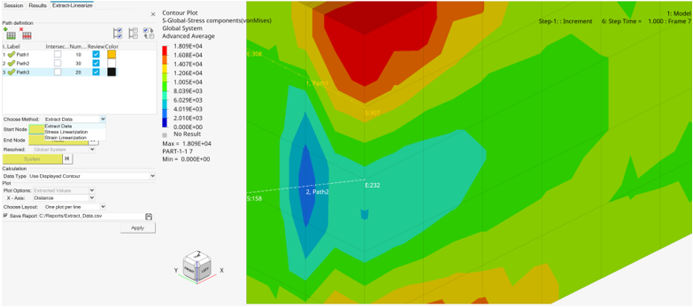 ソリッド要素上に定義されたパス(応力分類線とも呼ばれる)に沿った様々なポイントで応力またはひずみデータを抽出し、抽出された値に基づいて線形化された応力またはひずみを計算します。