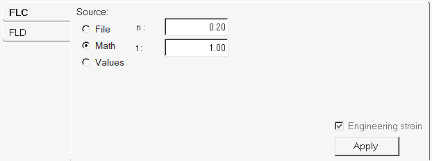 オプション 説明 File 既存のファイルからカーブを読み込みます。ファイルブラウザボタンをクリックしてファイルを選択します。 重要: Fileオプションを使う際、使用するファイルにはヘッダー、XYDATA、材料名およびフッター(すべて大文字)が含まれていなくてはなりません。ヘッダーとフッターの間のデータは、スペースで区切られた2つのカラムで書かれている必要があります。Math 加工硬化指数(n)および材料板厚(t)の値を入力することによって、数学的にカーブを定義します。 fld0の計算には、以下の式が使用されます: