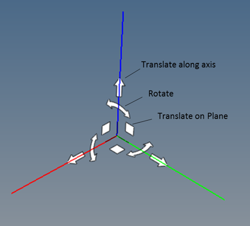 マニピュレータのセンターポイントは、空間内で自由にドラッグできます。レーキのアウトラインは、マニピュレータが中央に留まるよう、同じ平行移動を受けます。切断面はその法線方向にドラッグされ、マニピュレータは、マウスの動きに基づいて断面のプレーン上を移動されます。各矢印は直線に沿って自由にドラッグでき、断面に垂直な矢印がドラッグされない限り、断面上のマニピュレータの位置のみが変化します。弧状の矢印は、掴んで、切断面を面への法線周りに回転させることができます。正方形ハンドルは、空間内で自由にドラッグして、切断面の場所を修正することができます。切断面内でマニピュレータを移動しても、断面自体の位置に影響が及ぼされることはなく、単にマニピュレータのベース位置のみが影響されます。