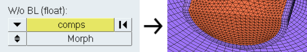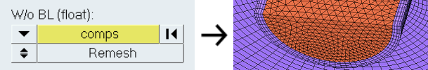 | With BL (fixed/float) | 境界層を作成する必要のあるサーフェス領域を定義する三角形要素または四角形要素を選択します。 微調整ボックスにWith BL (float)セレクターにより選択された境界シェルが含まれremeshが使用されている場合、微調整ボックスに与えられている要素サイズによってサーフェス要素がリメッシュされます。 |