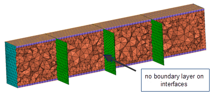 | W/o BL (fixed / float) | 境界層を必要としない境界領域を定義する三角形要素または四角形要素を選択します。 オプションW/o BL (fixed)は、例えば、2つの隣接するボリュームに連続的にメッシュが作成され、接触部の整合性が確実に保たれている場合などに使用します。このようなケースでは、接触部の共有要素はW/o BL (fixed)として選択される必要があります。 |