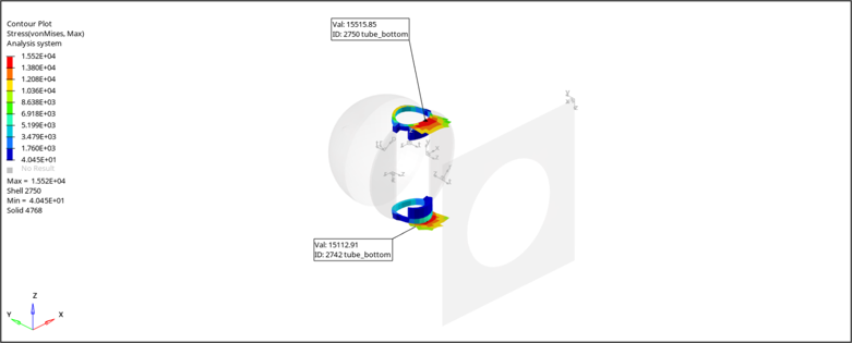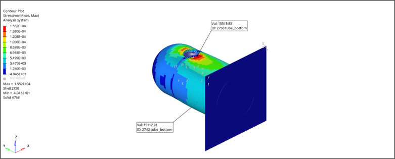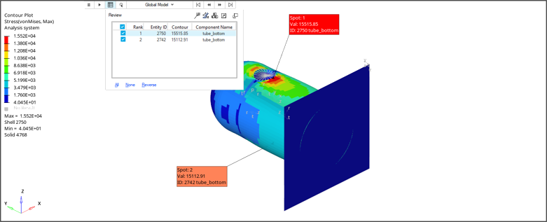 ホットスポット検出ツールを使用して、プロットされた結果に基づいてモデルにおけるクリティカルな領域を見つけ、選択セット、しきい値、最小分離、および荷重ケースに基づいてエンティティをフィルタリングします。また、検出結果を注釈や画面上に表示されている選択可能な詳細データと共にプロットすることができます。