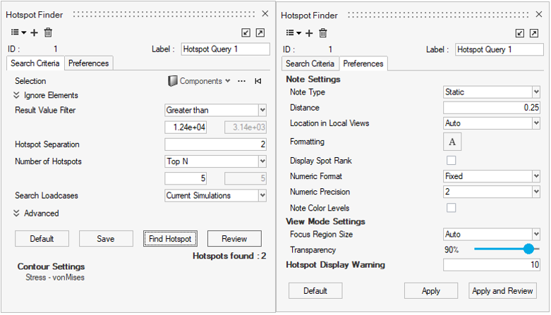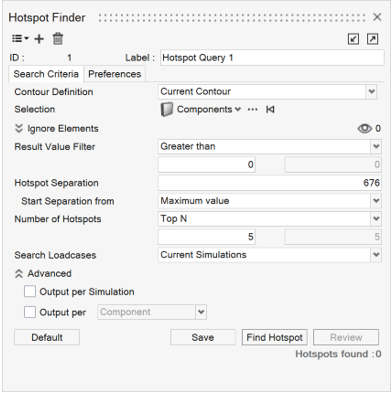 Search Criteriaタブには、コンポーネント、要素、節点、材料、プロパティ、アセンブリ、または座標系の選択を行うためのオプションがあります。また、ホットスポット検出から特定の要素タイプを無視する方法も提供します。さらに、ホットスポットは、指定されたしきい値をもとに、より大きい、より小さい、範囲内、または範囲外など、検索結果をフィルタリングすることができます。ホットスポットの検索結果のすべてがモデルの同じ領域から来ていないことを確認するために、ホットスポット間の最小距離を設定することもできます。その後、表示対象とするホットスポットを、リストの上から、あるいは下から選択することができます。
