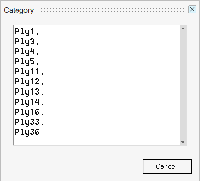 | Contributing Categories | Categoryダイアログを表示します。ここには、現在選択されているコンターに寄与しているすべてのカテゴリーがリストされます。 ![]() MinLayer、MaxLayer、またはExtremeLayerプロットの場合、寄与する層 / プライの名前がすべて表示されます。これは、(カラーバンド数が寄与するプライより少ないため)カテゴリーのグループ化が発生する場合に、すべての層 / プライを特定するのに役立ちます。 |