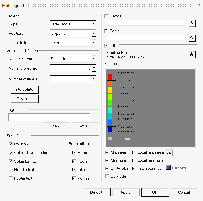 Title | レジェンドのタイトルを表示します。タイトルは、コンターの生成に使用される設定を反映し、変更はできません。フォントボタン![]() |