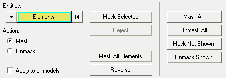 Maskパネルの左側にあるオプションは、入力コレクターで指定されたエンティティタイプ(Elements、Components、SystemsまたはAssemblies)に適用されます。定義された選択セット、もしくはそのタイプのすべてのエンティティをマスクまたはマスク解除することが可能です。入力コレクターによってセットを定義、もしくは画面からエンティティをピックすると、Mask SelectedまたはUnmask Selectedを使ってセット全体をマスクまたはマスク解除できます。エンティティの選択にクィックウィンドウ選択を使用した場合、アクティブとなっているActionオプション(MaskまたはUnmask)が、ウィンドウ内のエンティティに自動的に適用されます。