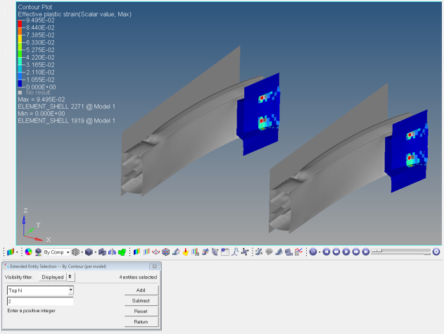 オーバーレイされたモデルについて、この選択法はモデル毎をベースとして機能します。例えば、拡張エンティティ選択 -- By Contourを使って要素を選択し、N=2であるTop Nを検索したい場合、HyperViewは4つのエンティティ(各モデルについて2つずつ)を選択します。