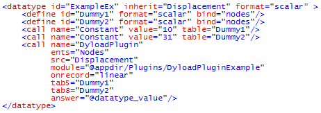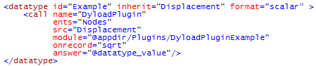 シンタックスは他のプラグインのシンタックスと類似しています。<call "name"="Dyload Plugin"…>引数は、動的にするモジュールを特定します。< …"module"=… >引数は、コンパイルされたプラグインモジュールへのフルパスを定義します。