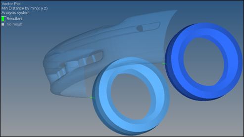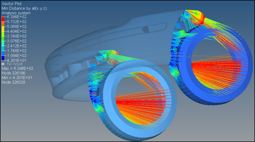 NSMinDisance演算子を用い、表示のオプションを"byall"に設定した際の、2つの節点セット(the tire)から1つの要素セット(the bumper fascia)への最小距離の計算:図 1.