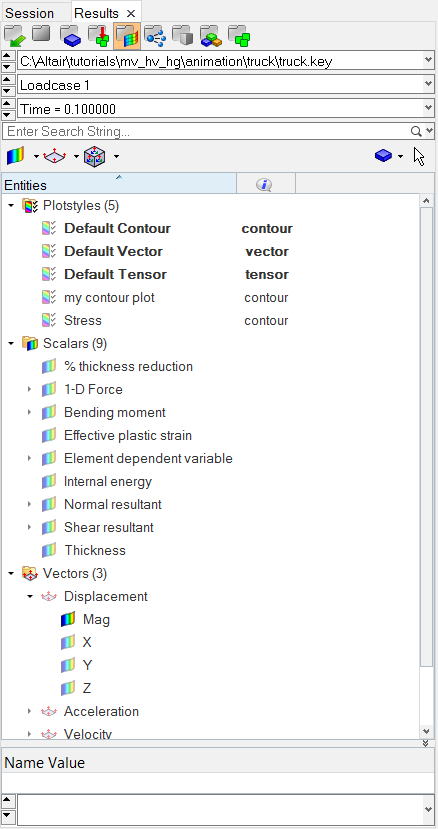 Resultビュー は、現在の荷重ケースの使用可能な結果を階層構造で示します。