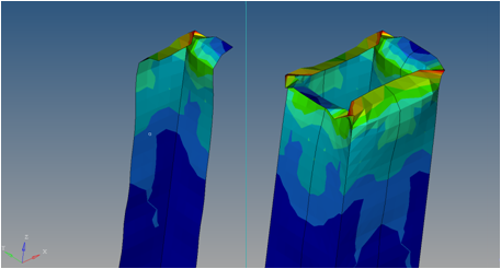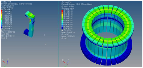 - コンポーネント(形状)、結果(コンター / ベクトル / テンソルプロット)、展開の結果、断面、追加されたオブジェクトおよびトレーシングが、複製された形状に鏡映 / コピーされます。軸対称性の場合、形状および適用されているコンターは3次元形状にスイープされます。 注: いくつかの場合、結果が節点または要素コーナー上にある際は、生成された3次元形状のフェイス上のコンターは、元のコンポーネント上のものと異なることもあります。これは、HyperViewが3次元要素vs2次元要素上でコンターをレンダリングする差異のためです。