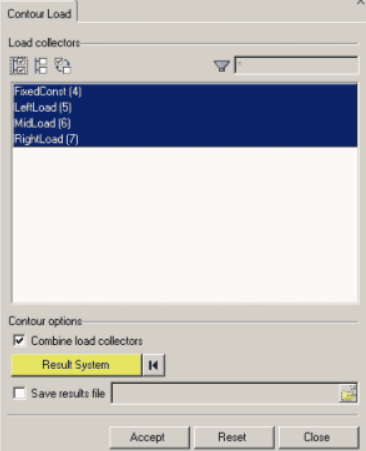 | Accept | Contourツールを開きます。このパネルでは、目的のコンターを生成するために、シミュレーションとそのシミュレーションで使用するデータタイプを選択する必要があります。シミュレーションは荷重タイプに対応し、データタイプは、選択された荷重コレクター内に含まれる荷重タイプのリストです。 各シミュレーションは、1つの荷重コレクターに対応します。1つの荷重コレクターに複数の荷重タイプが含まれる場合、複数のデータタイプが使用できます。Combine load collectorsオプションを使用する際、上記のとおり、1つのシミュレーションのみが"Combined Results"という名で存在します。 |