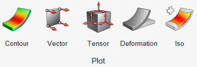 - 現在のプロット:これは、プロッティングへの‟オンデマンド”アプローチです。プロットガイドバーでは、“Current Contour”(またはCurrent VectorかCurrent Tensor)というアイテムが定義リスト内に表示されます。このアイテムを使用して任意の結果タイプをプロットできます。データはプロット時にファイルから読み込まれます。異なる結果をプロットするには、ガイドバーのView/Editボタンを使用して“Current Contour”(またはCurrent VectorかCurrent Tensor)の定義を変更し、再びプロットします。前にプロットされた結果がメモリからクリアされ、今度は新しい結果がプロットされます。注: