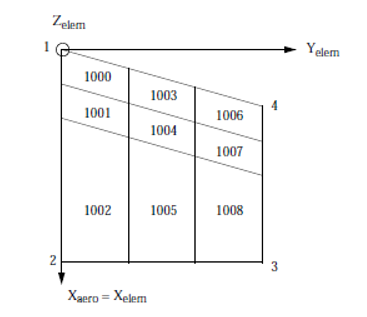 2. イメージアイコンには、CAERO1のメッシュ時に従うべき番号付け方式とパターンに関する詳細情報が含まれています。例えば、開始節点と要素IDはコンポーネントIDと同じである必要があります。番号付けは、コード方向に連続的インクリメンタルされ、スパン方向に継続される必要があります。