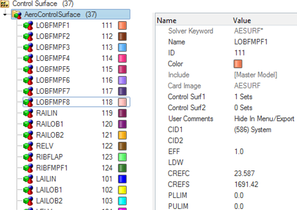 翼やスタビライザーエリアの可動体を識別することができます。Aeroelasticityブラウザエンティティエディターは、制御面と必要なデータを定義するために使用されます。