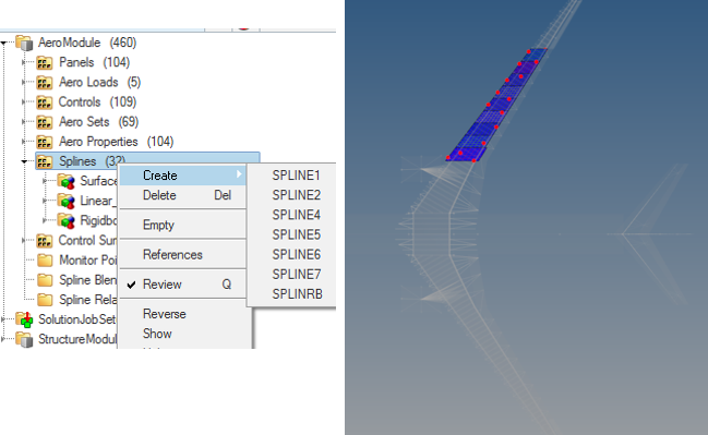 ここでは、航空宇宙荷重を構造物に伝達するためのSPLINExタイプのエンティティを定義します。エンティティの定義は、Aeroelasticityブラウザを使用します。