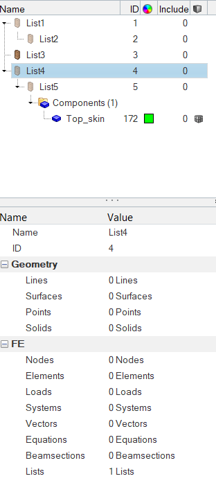 モデルの一部の解析実行を設定できます。Listブラウザでは多くのリストを作成でき、要素、パート、荷重、セット、および座標系を複数のリストグループ内で複製することもできます。この操作は、要素 / 節点の一意性が要求されるパート / サブシステムを使用して行うことはできません。
