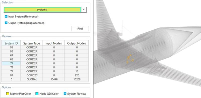 座標系節点の確認 座標系節点確認ツールを使用して、局所参照座標系または解析座標系が割り当てられている節点を検索します。 メニューバーでAerospace > Systems > System-Node Reviewをクリックします。 座標系IDを選択します。 座標系タイプを選択します。 Findをクリックします。 モデルの各種座標系に関連付けられた節点が表示されます。 図 1.