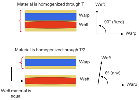 縦糸方向と横糸方向のマトリックス、トウの均質化。このスケールは、均質化された織りプライタイプでサポートされています。 | ドレープするのは現実的ではありません。θ=90°から少しでもずれている場合は新しい異方性材料となります。 プライレベルの繊維とマトリックスの方向の結果を区別することはできません。 |
