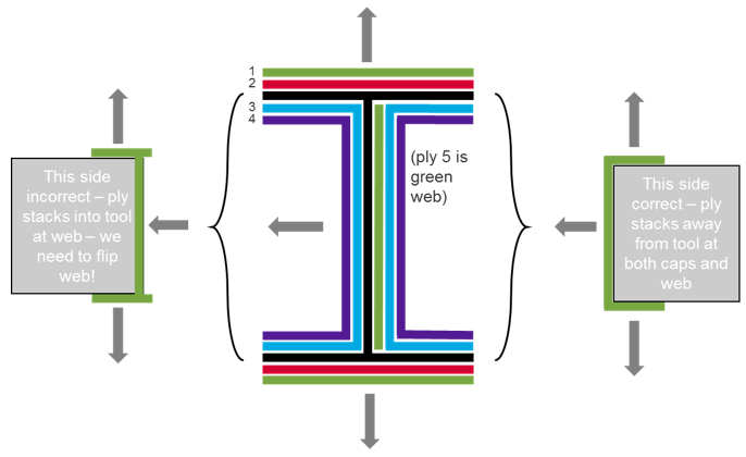 このI型ビームモデルの左側の積層方向の不連続性は、プライ法線を使用して修正されます。プライ法線によって、個々のプライが積み重なる方向が操作されます。プライ法線ツールを使用してプライ法線を反転させると、そのプライのドレープテーブルが作成されます。これにより、プライ方向から2*θだけ差し引かれます。これは、プライが積み重ねられる方向を反転させることと数学的に等しくなります。
